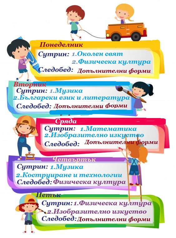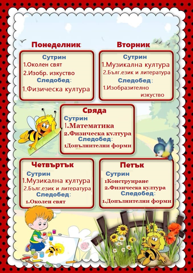 Нашата седмична програма по дни в занимания и игри минават интересно и забавно дните ни.
